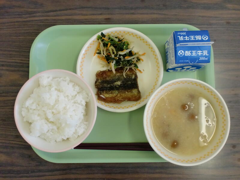 ご飯 なめこ汁 たくわん和え さんまのかば焼き です。ごちそうさまでした。