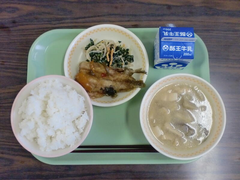 今日の献立は ご飯 大根のみそ汁 ほうれん草のごまあえ いわしの南蛮漬け です。