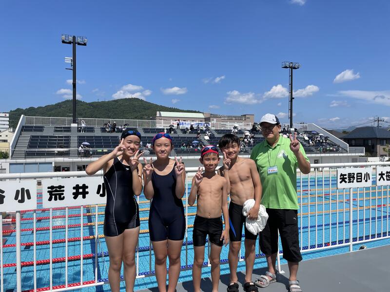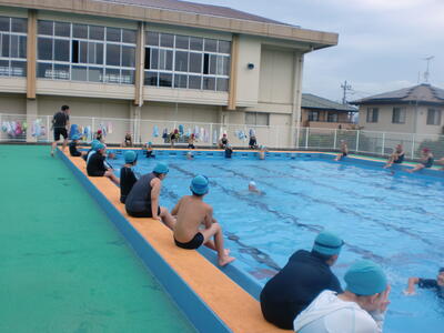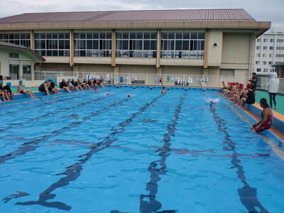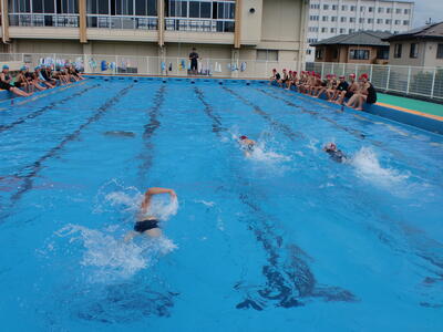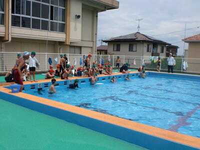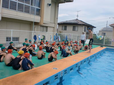 市小学校水泳競技大会に出場する選手の皆さん。この大会は今回が最後になります。ベストを尽くして頑張ってください。