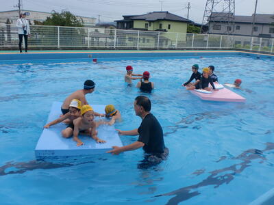 心配された雨も降らず、子どもたちは広いプールでのびのびと、思いっきり遊びました。特に、大きな板の上にのると、みんなは大はしゃぎ!とびっきりの笑顔で最後の水遊びを満喫していました。