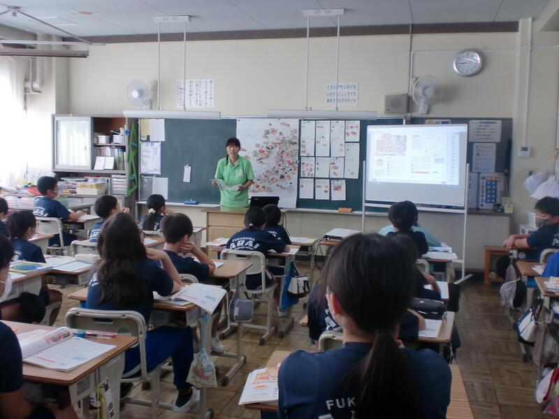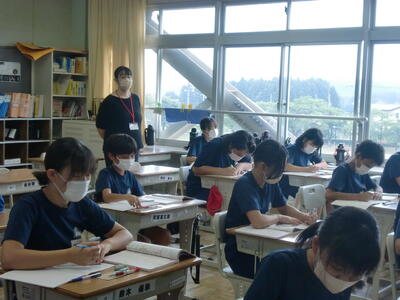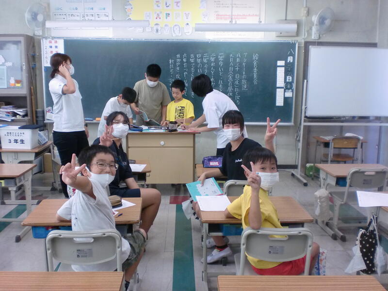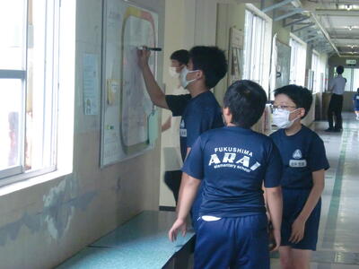 今日も校庭や体育館での活動は中止です。エアコンの効いた教室で、一生懸命学習に励みました。3・5・6年生の社会科の様子です。