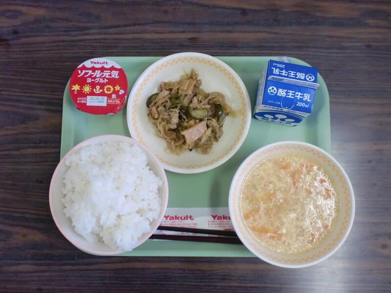 ご飯 ヨーグルト 中華風コーンスープ 豚肉ときゅうりのオイスターソース炒め です。