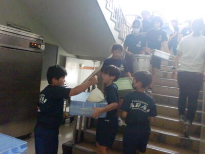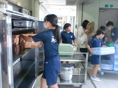 今日で1学期の給食が終わりです。全校生が毎日おいしい給食を食べることができるのも、配食員さんや給食委員会のみなさんが、準備や後片付けをしてくれるおかげです。