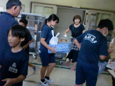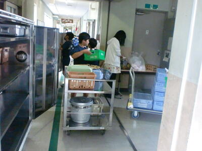 それぞれの学年が持ってきた食器などを預かって、コンテナに入れます。