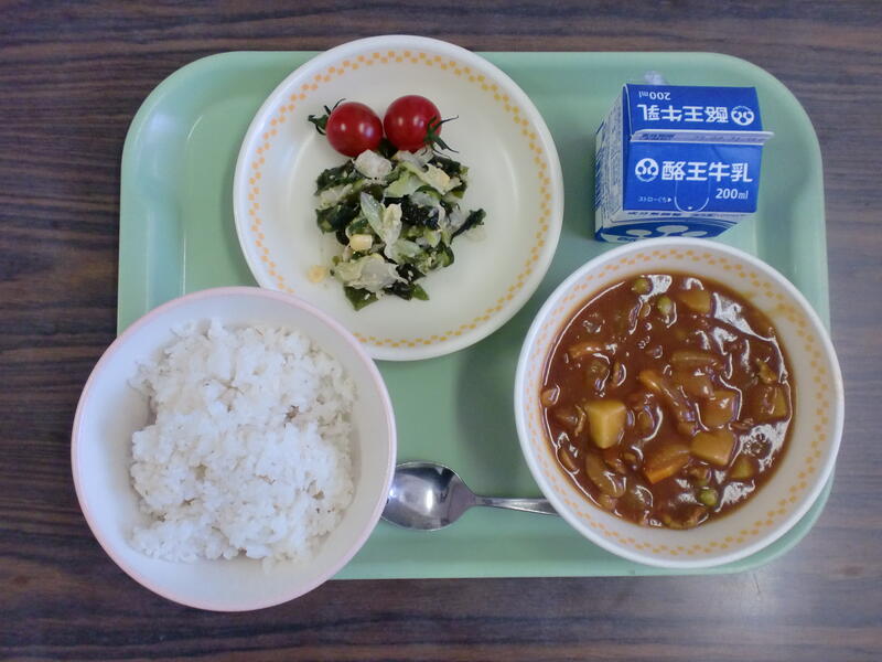 夏のおやつには、野菜がおすすめです。今日の給食に登場したミニトマトやキュウリなどは洗うだけでそのまま食べることができます。おやつは、3回の食事で不足する栄養素を補うことが目的です。お菓子ばかりにならないようにしましょう。~こんだてアラカルト~より