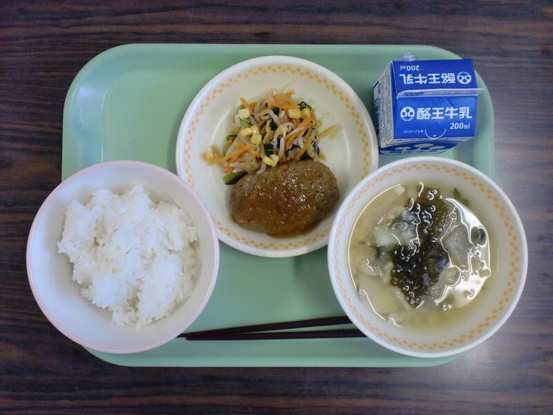 ごはん わかめのみそ汁 ごぼうと小松菜のサラダ ハンバーグおろしソースかけ