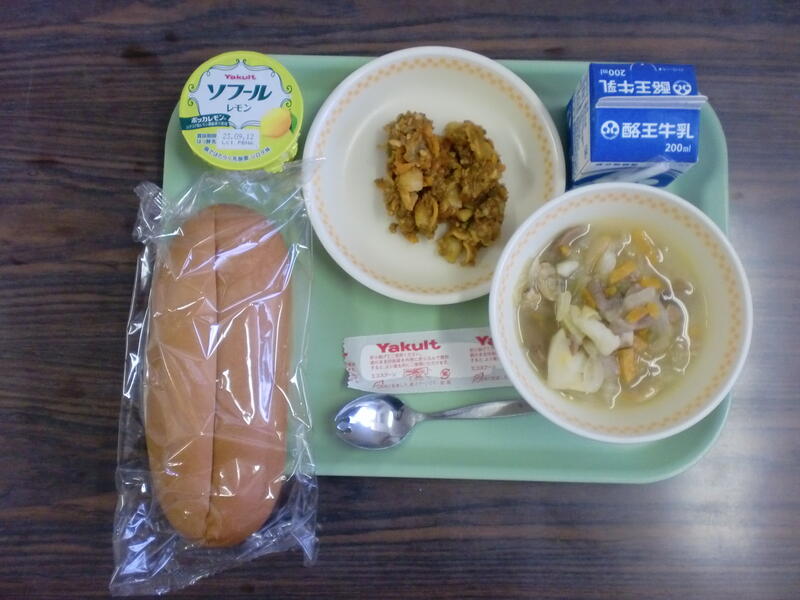 切り目入り米粉パン あさりのコンソメ煮 マカロニドライカレー ヨーグルト
