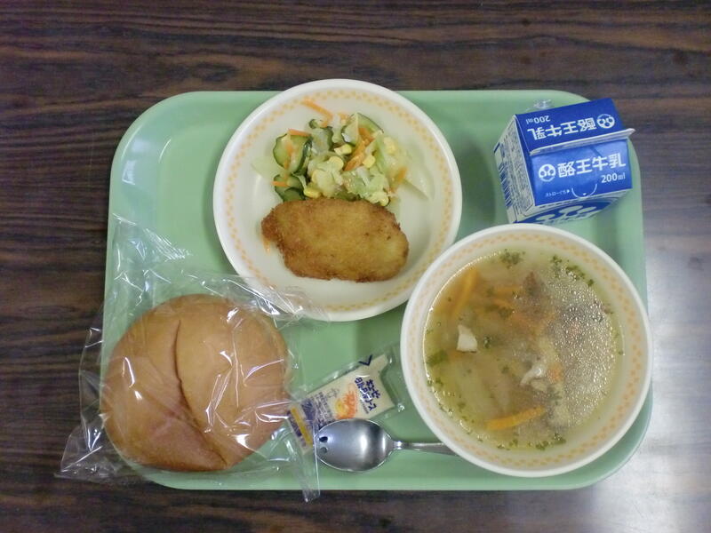 今日の献立は 切れ目入り丸パン コンソメスープ 白身魚フライ パックタルタルソース フレンチサラダ です