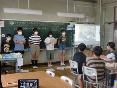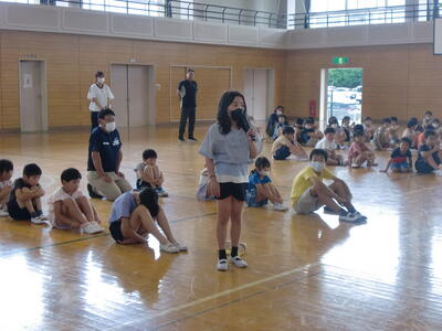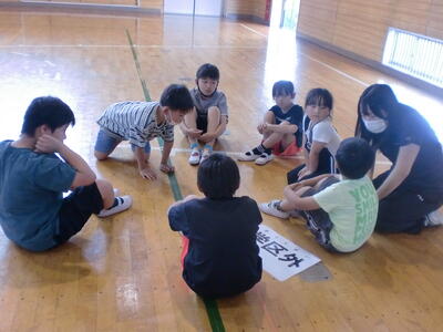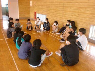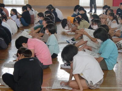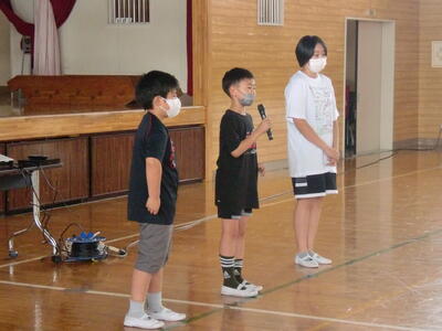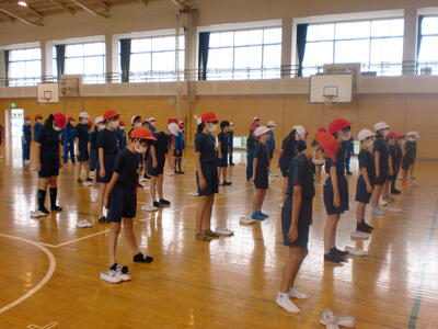 昼休みに、通学班の反省会が体育館で行われました。この1学期、通学班として、「よくできたこと」「あまりできなかったこと」「2学期がんばりたいこと」の3点で話しました。「時間に遅れることがあった」「二列で歩いてしまった」「あいさつがあまりできなかった」等、各班ごとの反省を確認し、2学期は、よくなかったところをしっかり守れるよう確認しました。