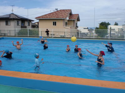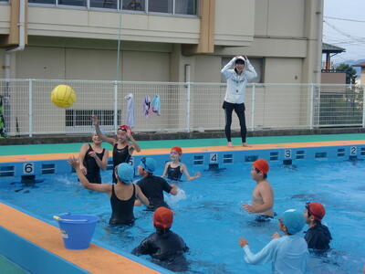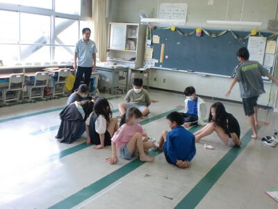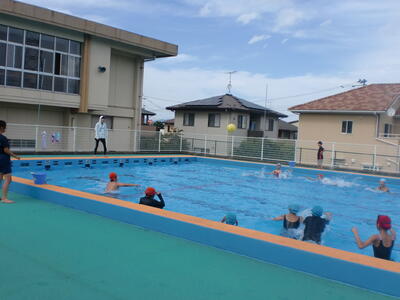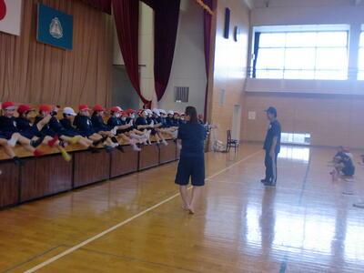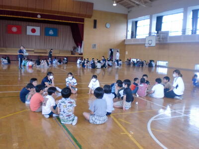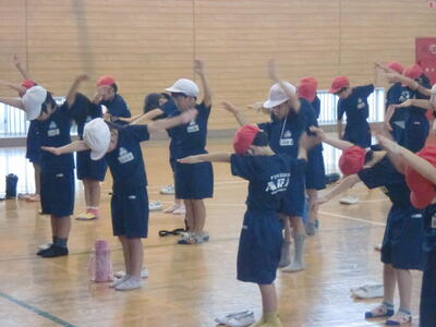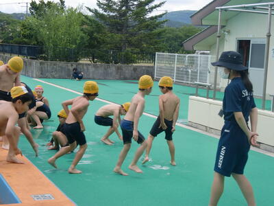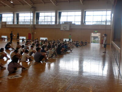 今日から4回、子どもたちの水泳指導に市の水泳連盟から先生が来て教えていただきます。1回目の今日は、あいにくの雨。そこで、体育館で2学年ごとに身振り手振りで上手に泳ぐための大切なポイントをわかりやすく教えていただきました。次回は7月5日(木)です。今度はプールに入れるといいですね。
