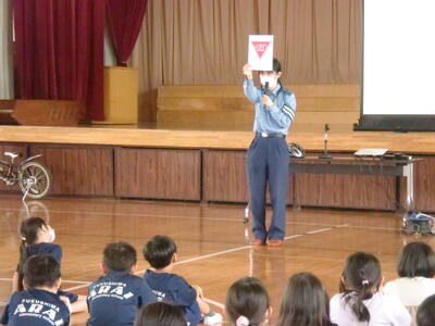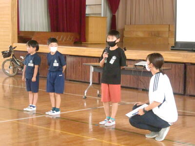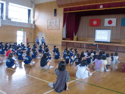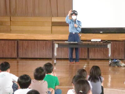 上学年と下学年に分かれて、DVDを見たり、駐在所の方から自転車の点検の仕方、ヘルメットの正しいかぶり方、そして交通ルールについて、分かり易い説明をいただきました。夏休みになると自転車に乗る機会も増えてきます。安全に自転車に乗って楽しく過ごして欲しいですね。