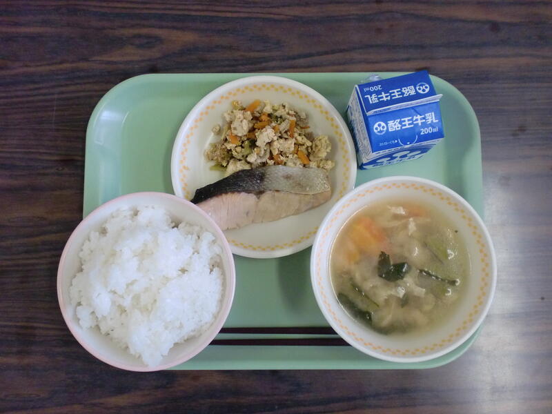 今日の献立は ごはん 小松菜のみそ汁 ゴーヤチャンプルー さけの塩焼き です。