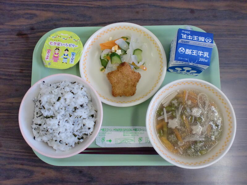 わかめご飯 七夕汁 短冊サラダ 星型コロッケ 七夕ゼリー です。
