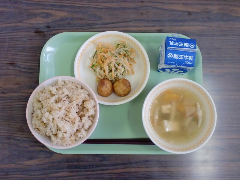 かやくご飯 船場汁 チキンともやしのサラダ 揚げたこ焼き です。