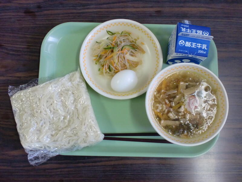 今日の献立は 中華めん わかめラーメンかけ汁 春雨サラダ 塩味付きゆで卵 です。おいしくいただきました