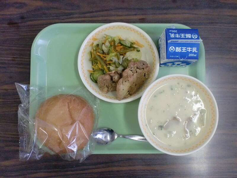 今日の献立は 切れ目入り丸パン コーンポタージュ 茎わかめのサラダ チキンハーブステーキ です。