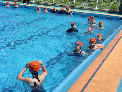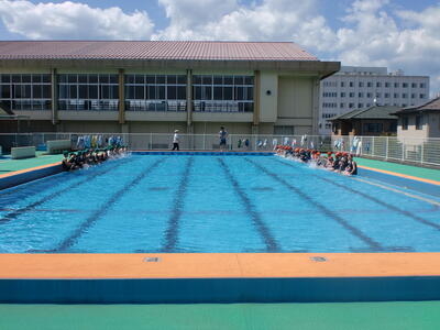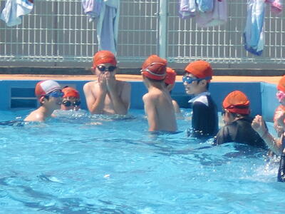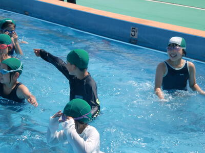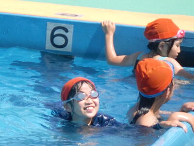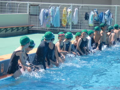 梅雨の間の貴重な晴れの日。午後から気温が上がり、いよいよ水泳の学習が始まりました。きれいなプールで3年生も4年生も歓声をあげて、水の感触を確かめていました。みんな気持ちよさそう。