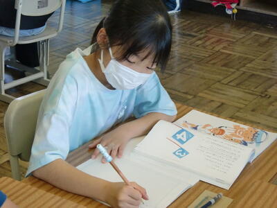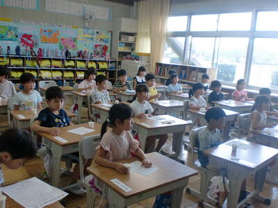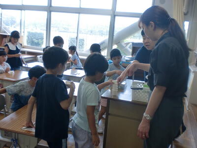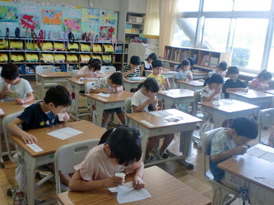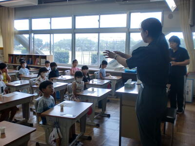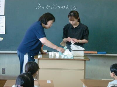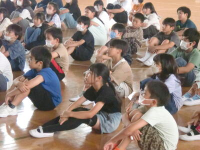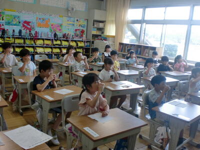 7月から、虫歯予防のためのフッ化物洗口が始まります。初めて行う1年生に養護の先生から、正しいやり方を教えていただきました。特に「フッ化物洗口後30分は水を飲んだりうがいをしたりはできないこと」「フッ化物洗口液は飲み込まず、1分間口の中でぶくぶくうがいをした後、紙コップに吐き出すこと」「吐き出した後はティッシュを紙コップの中に入れ、洗口液がこぼれないようにすること」この3つが大事です。