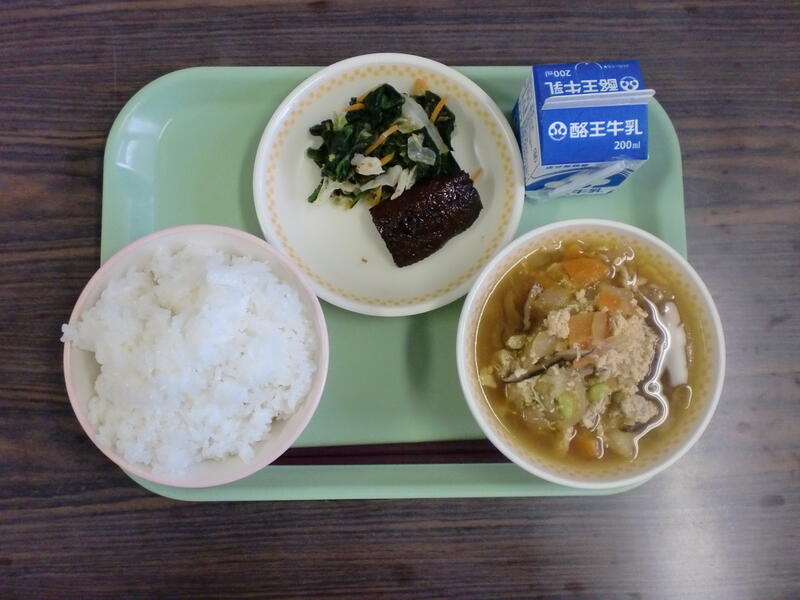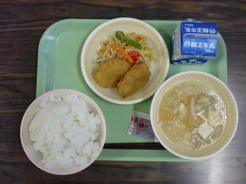 今日の献立は ごはん 豚汁 まぐろメンチカツ ごま酢あえ パックソース です