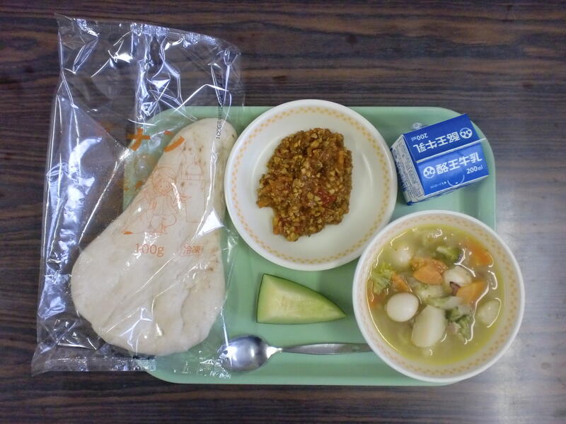 今日の献立は ナン 野菜のコンソメ煮 大豆入りドライカレー メロン です。