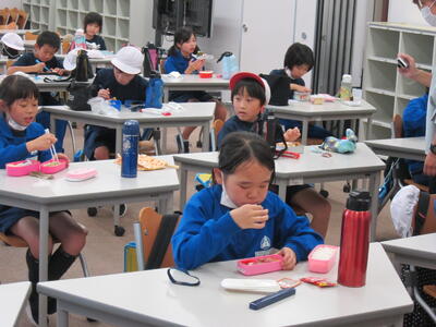 いつも給食を作ってくださるセンターの方々。学年ごとに分けていただいている配食員の方に感謝の心でいただきました