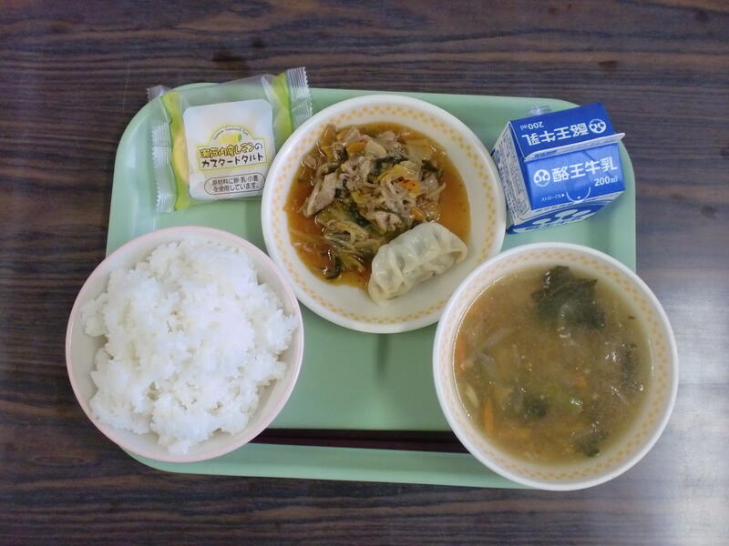 ごはん 中華風コーンスープ しそぎょうざ 豚キムチ炒め レモンタルト です。今日のデザートはレモンタルト。
