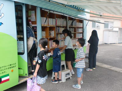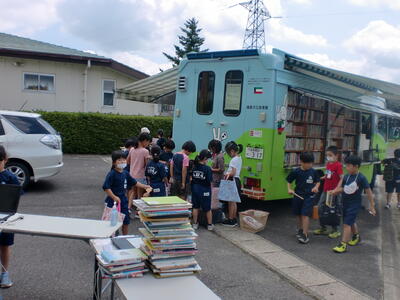 福島市内の各小学校には、「しのぶ号」という市立図書館からの移動式図書館が定期的にやってきます。学校の図書室にはない本ばかりなので、子どもたちはこの日を楽しみにしています。これからもたくさん本を読んでくださいね。