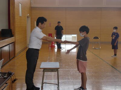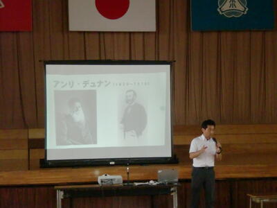 6年生の代表児童に校長からJRCのバッジを渡し、もう一人の代表児童が誓いの言葉を述べました。その後赤十字について話を聞き、子どもたちは自分たちがJRCの一員になった意義を理解することができました。