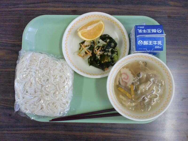 今日の献立は ソフトめん 山菜うどんかけ汁 和風和え 国産オレンジ です