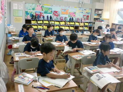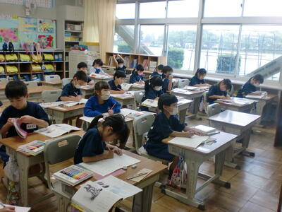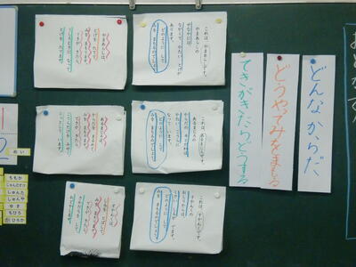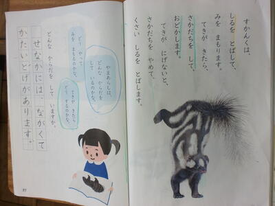 1年生の国語は、説明文「どうやってみをまもるかな」の学習です。「やまあらし」「あるまじろ」「すかんく」の3匹の動物の身の守り方について、筆者はどのような書き方で読み手に伝えているのか考えました。すると、3つの動物は、どれも同じ書き方で説明をしており、その方が読み手にはわかりやすいことを学習しました。