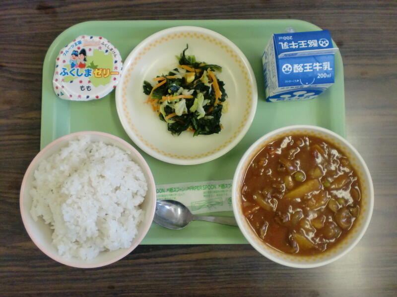 麦ごはん 県産牛ハヤシライス ほうれん草サラダ 県産桃ゼリー です。おいしくいただきました