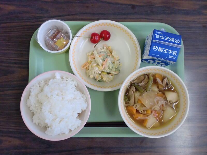 ごはん 肉じゃが ごまねーずサラダ 納豆 さくらんぼ です。