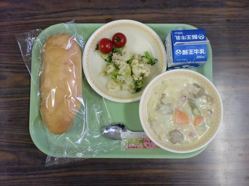米粉コッペパン はちみつりんご アスパラシチュー 花野菜とツナのサラダ ミニトマト です。