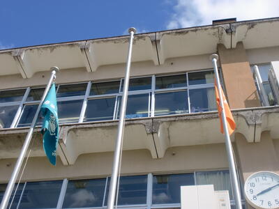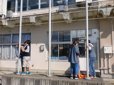 昨日とはうって変わって気持ちのいい天気。今月は、4年生が旗をあげています。