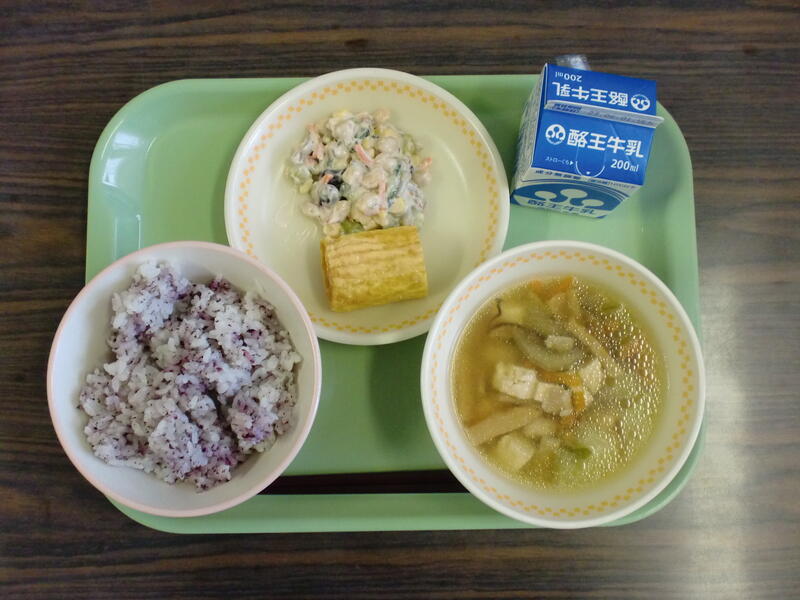 ゆかりご飯 エビボールスープ 豆サラダ ウィンナー入り卵焼き です。
