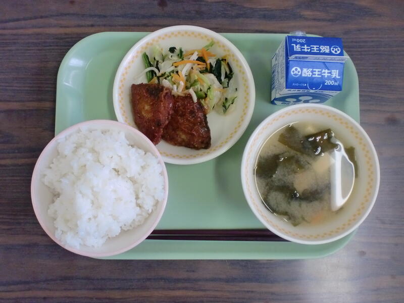 ご飯 わかめのみそ汁 からしあえ かつおのケチャップソースがけ です。