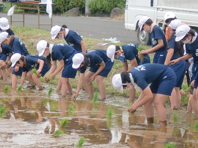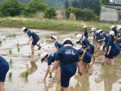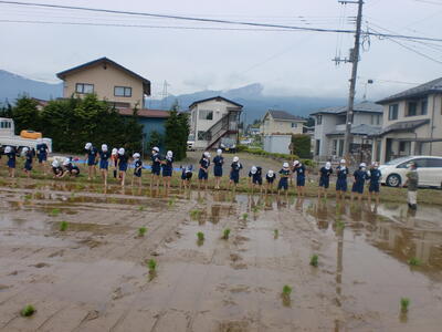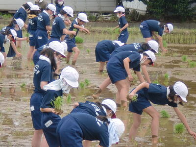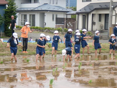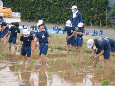 5月2日(火)にまいたお米の種から芽が出て、すっかり大きくなりました。今日はいよいよ田植えです。始めてはいる田んぼの感触に大騒ぎしながらも、一つ一つ丁寧に植えることができました。その大変さに、昔の農家の方の苦労を少しでも理解することができたようです。
