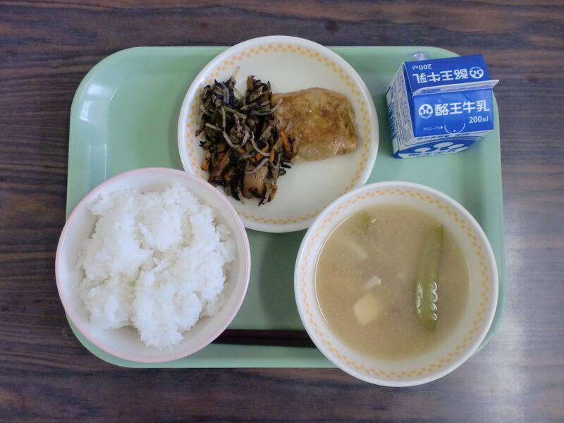 ご飯 なめこ汁 ひじきのいため煮 鶏肉のカレー焼き です