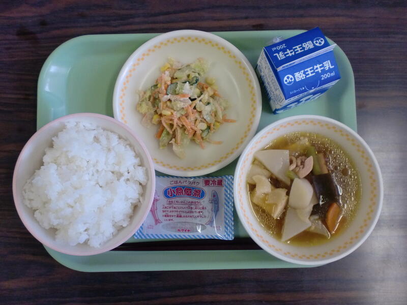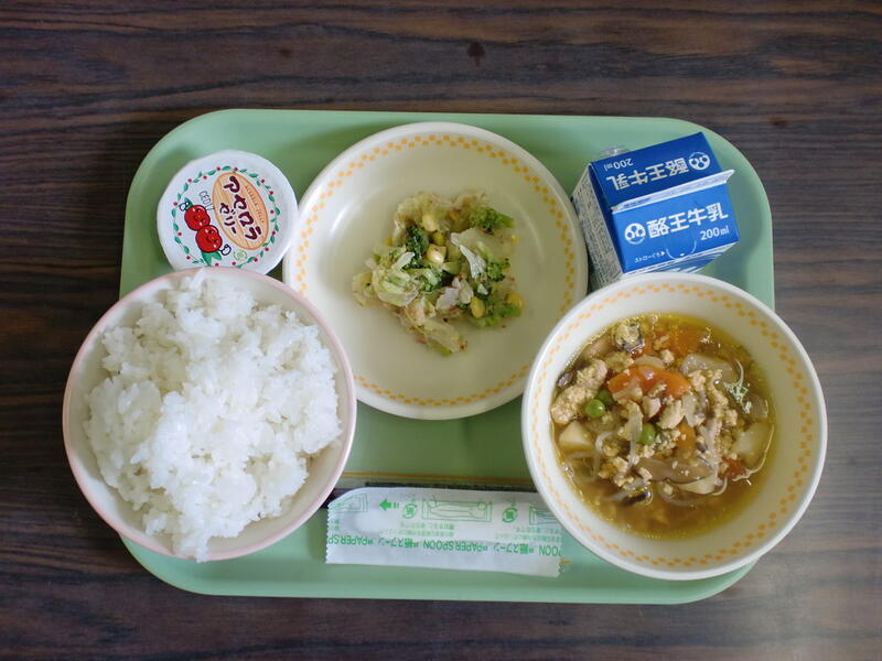 ご飯 親子煮 味のり おかかマヨサラダ アセロラゼリー 牛乳
