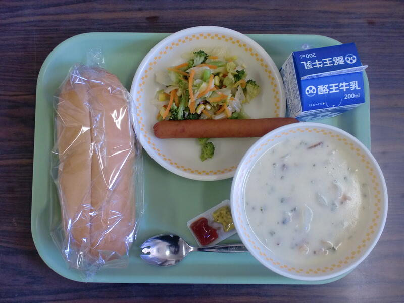 切れ目コッペパン クラムチャウダー ブロッコリーサラダ フランクフルト ケチャップ&マスタード