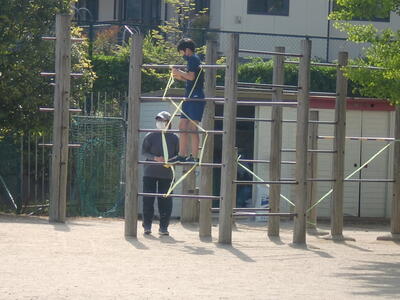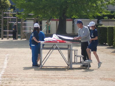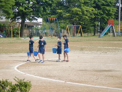 いよいよ明日は運動会。5・6年生が、校庭の石拾いをしたり、遊具をテープでまいたりと明日の準備を行いました。当日の午前中は曇りの予報ですので、今のところ実施の予定。朝6時15分に花火があがります。それで正式決定です。