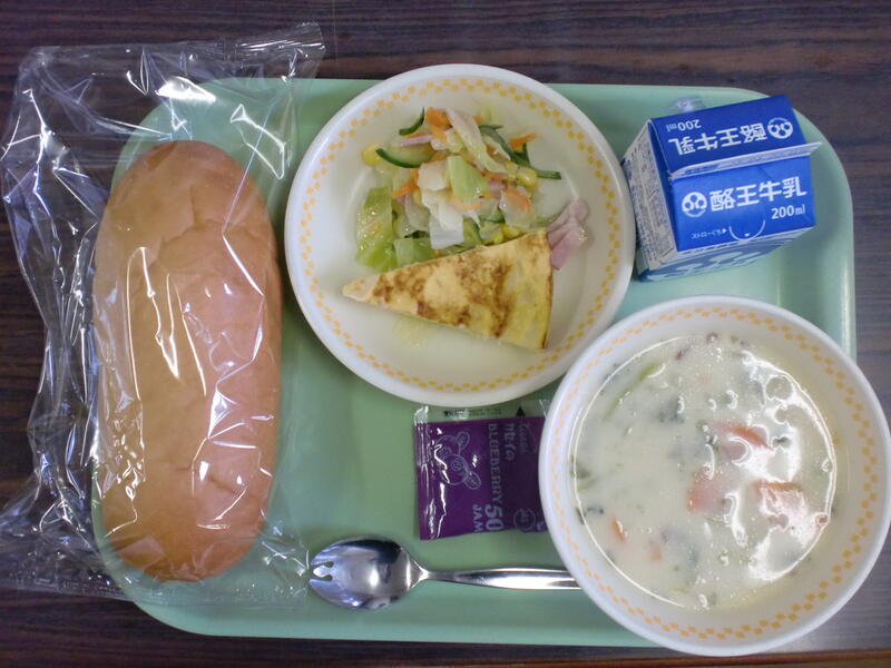 コッペパン ブルーベリージャム 菜の花入りクリームスープ スペイン風オムレツ