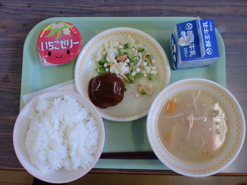 ごはん じゃがいものみそ汁 ハンバーグデミグラスソース 花野菜とチーズのサラダ イチゴゼリーです。