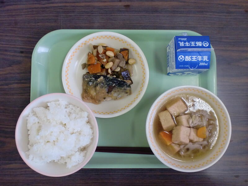 ごはん 根菜汁 さばのみそ煮 五目豆 です。よくかんで、味わって食べました