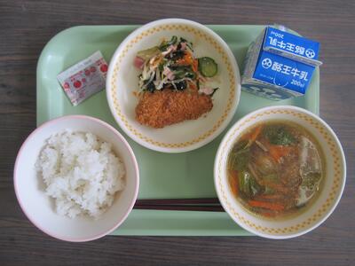 今日の給食は「だいすきふくしまの日」として、荒井小6年生(髙橋羽心さん)が考えた献立が出されました。メニューの内容は「春雨と肉団子のスープ、ささみフライ、海藻サラダ、その他」で、ポイントは「主菜がささみフライなので、サラダとスープに野菜をたくさん使ったこと」とのことでした。大変おいしくいただきました。次回2月20日(月)も予定されているのでお楽しみに!