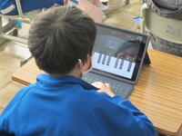 2月18日(金)、本来であれば授業参観を行い、子供たちの成長の様子を見てほしかったところですが、この状況を踏まえての対応となったことご理解いただければ思います。さて、今日は2年生の音楽の様子をご紹介します。実際の楽器は演奏できないので、タブレットを活用しキーボード演奏を行っていました。