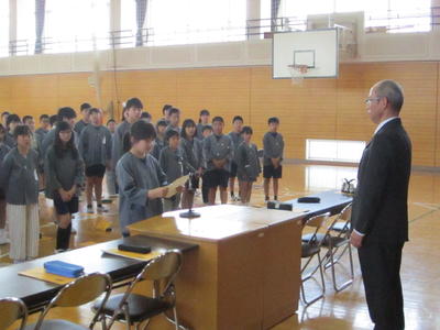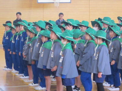 4月9日(火)に4・5・6年生が参加して緑の少年団結団式が行われました。団員相互に協力しながら自然を愛する心と育てていきたいと思います。代表児童に校長先生とPTA代表の方からスカーフと帽子が授与されました。