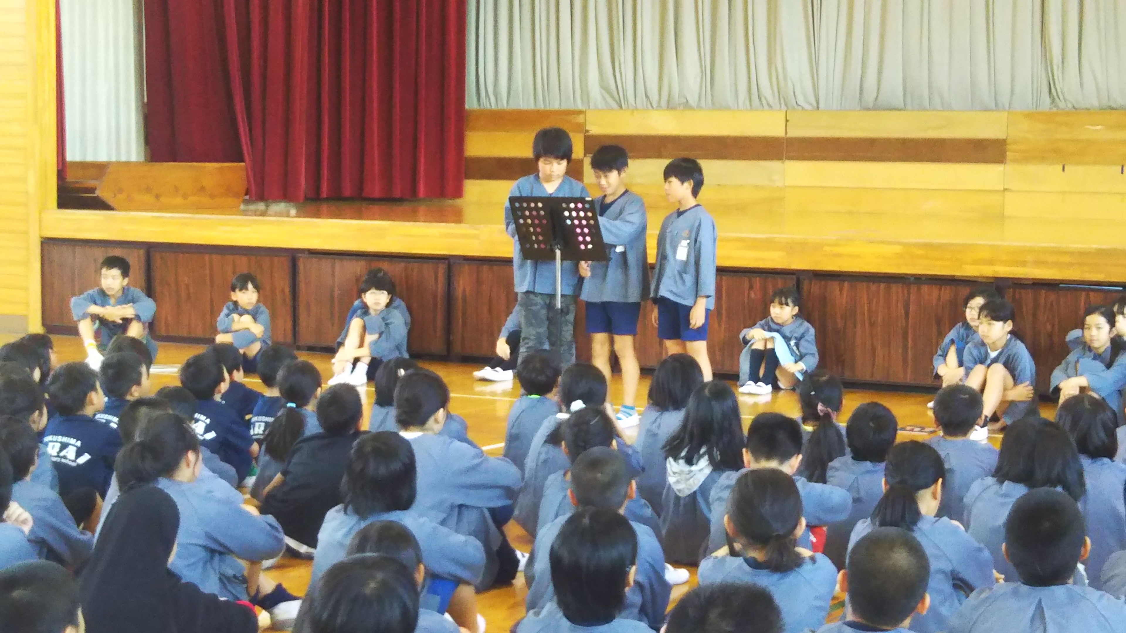 10月9日の集会は、全校生がもっと本に親しむようにと、図書委員が読み聞かせを行いました。