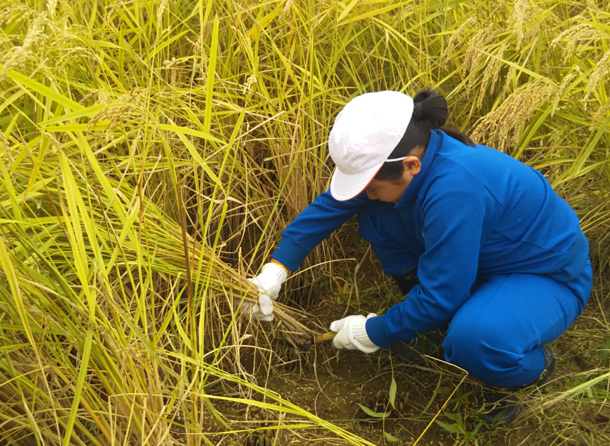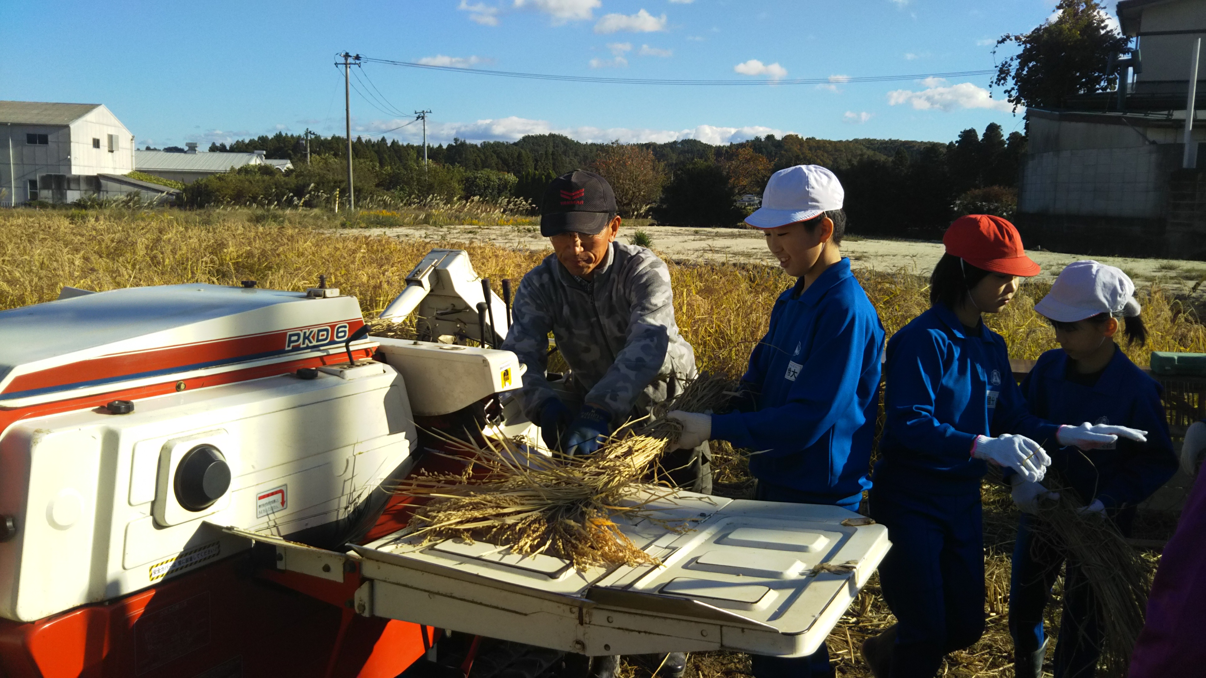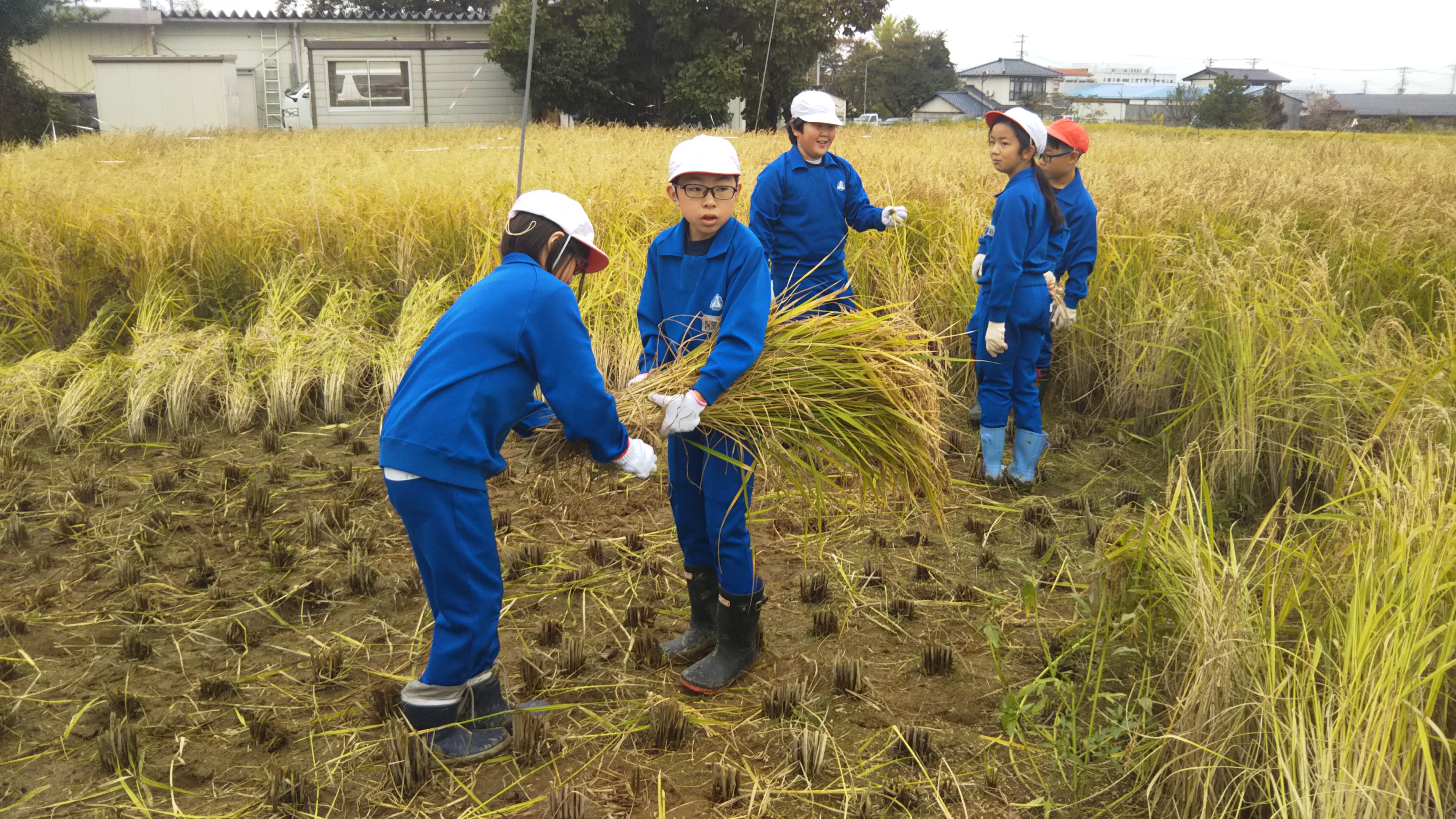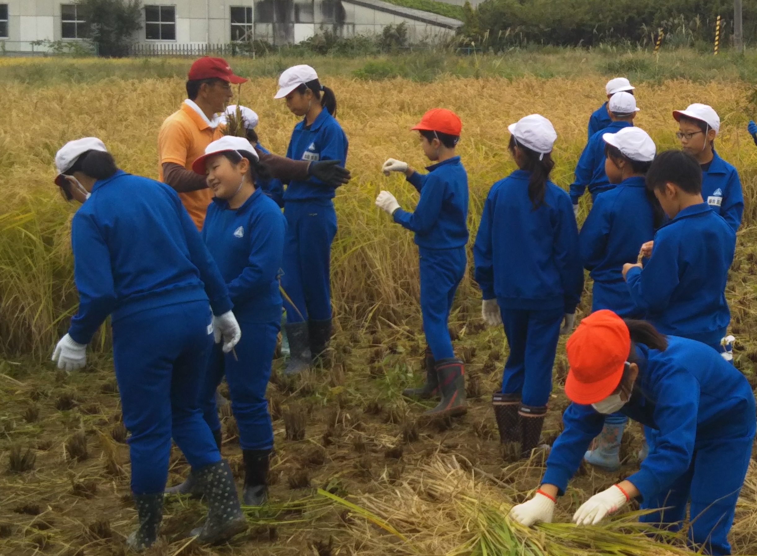 5年生は、春に田植えをした田んぼで稲刈りを行いました。「田んぼの先生」の、加藤勇治様にお世話になって、刈り方を教えていただき、丁寧に刈り取りました。