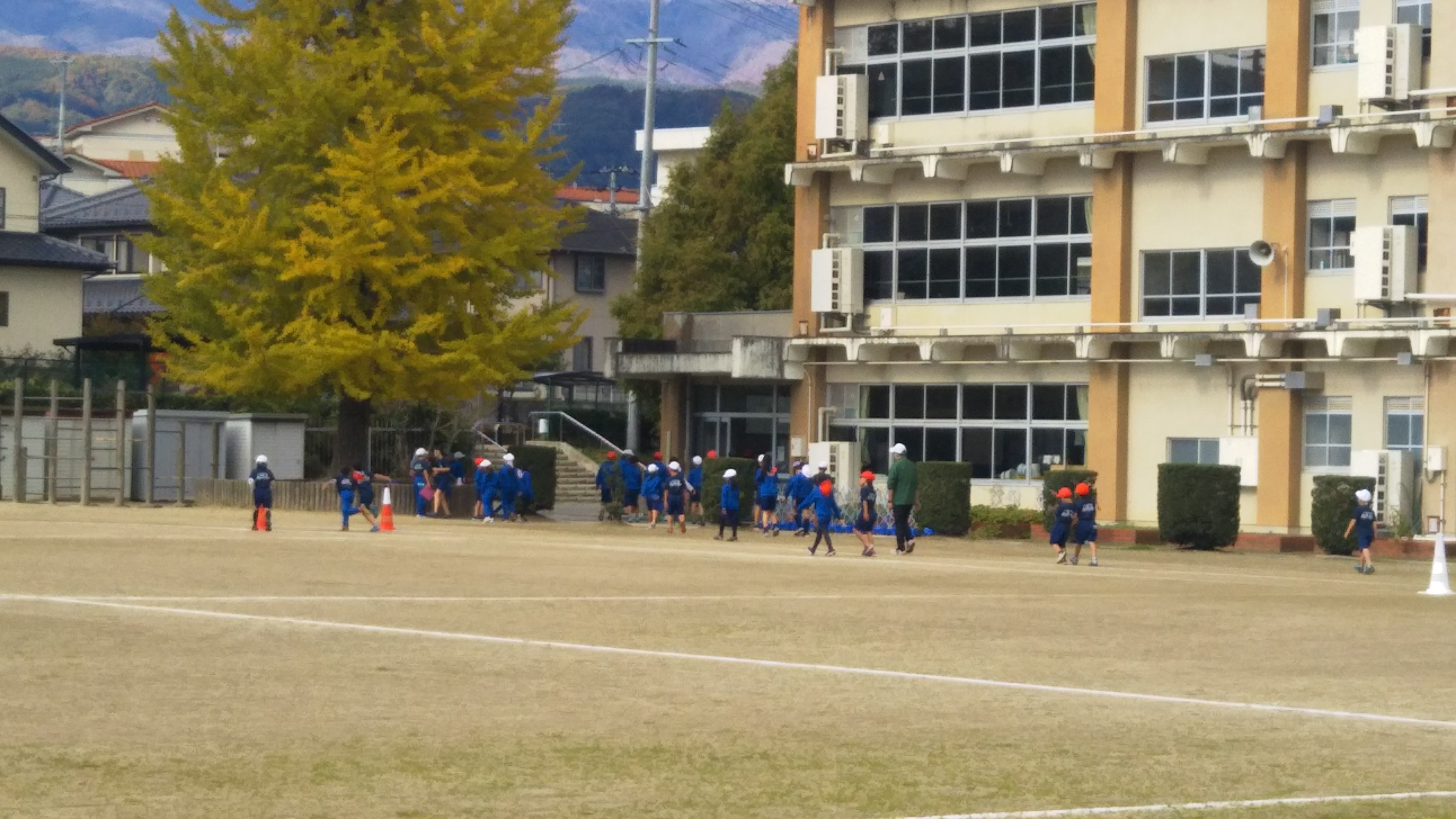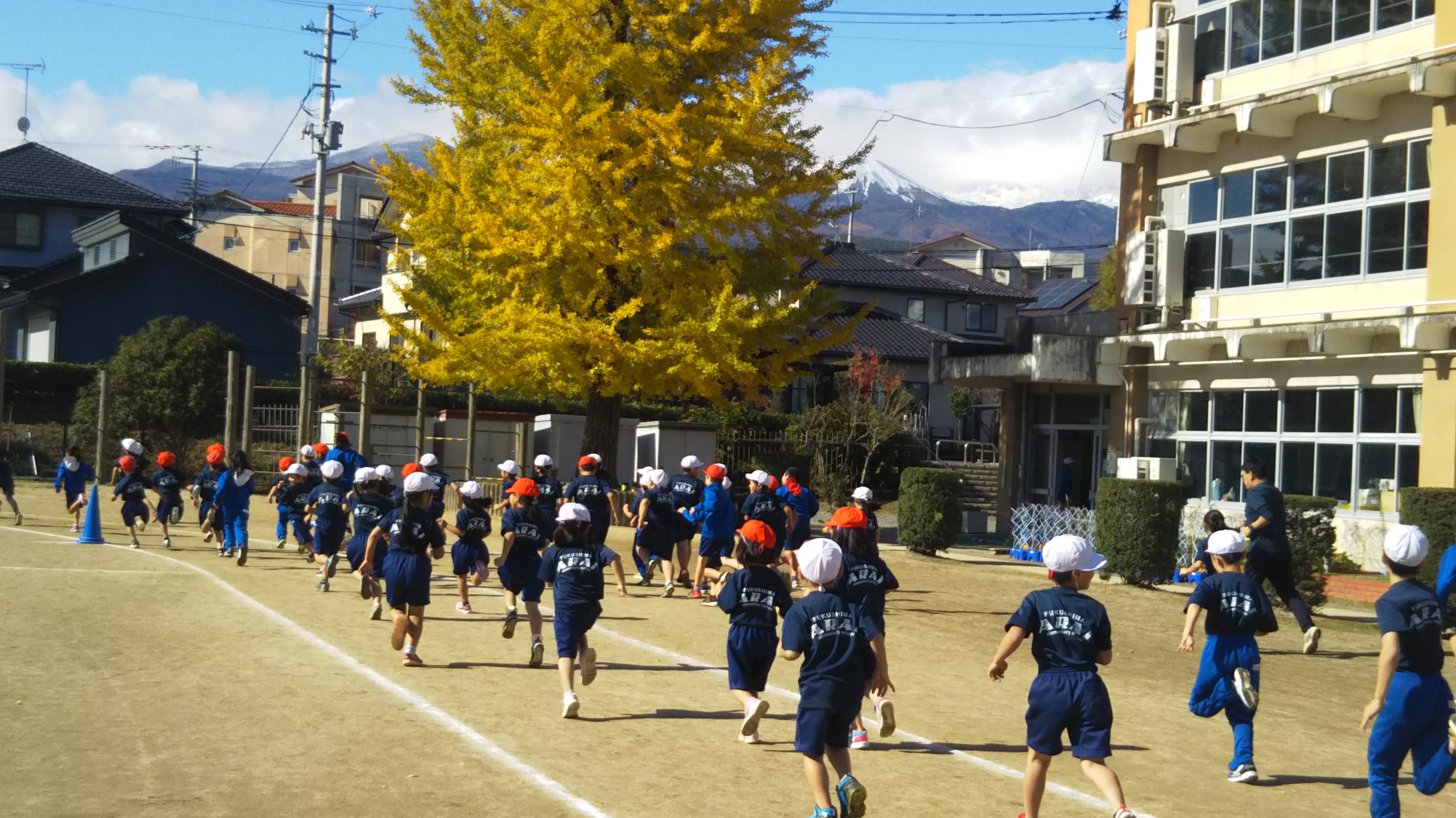 校庭から望む吾妻山は、すっかり白く雪をかぶっています。でも、子供たちは元気いっぱい。寒さを吹き飛ばすかのように、勢いよく走っています。